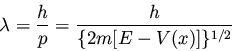 ![\begin{displaymath}\lambda = \frac{h}{p} = \frac{h}{\{ 2m [ E - V(x) ] \}^{1/2}}